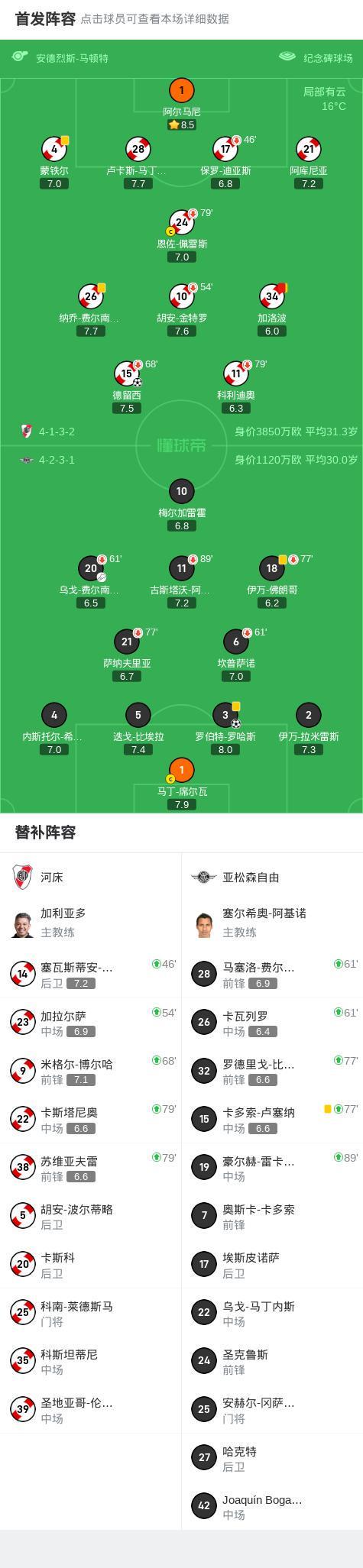 北京时间8月22日南美解放者杯 1/8决赛次回合,河床对阵亚松森自由。河床德留西破门。亚松森自由罗伯特-罗哈斯破门。最终比分河床 4-2 亚松森自由。两回合总比分河床4-2亚松森自由。精彩瞬间第29分钟,河床球员德留西打入一球。第43分钟,亚松森自由球员乌戈-费尔南德斯助攻罗伯特-罗哈斯打入一球。第52分钟,河床球队加洛波吃到第二张黄牌。球队阵容 技术统计...